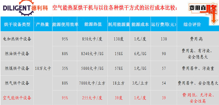 設備只需消耗少量的電能,就可以在空氣中吸收大量的熱量,耗電量?jì)H為電加熱器的1/4;同燃煤、油、燃氣烘干機相比,可節省70%左右的運行費用。1度電等于4度電。
