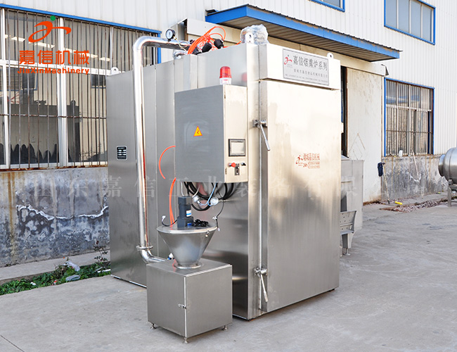 本設備由煙熏箱、自動(dòng)程序控制器、煙霧發(fā)生器、煙熏車(chē)四部分組成。關(guān)鍵部件是由蒸汽管道、熱交換器和出氣通道組成完善的循環(huán)系統,箱內熏煙與熱氣的混合氣體在兩組循環(huán)風(fēng)機的作用下,形成渦流區域,使混合氣體以適宜的速度平衡而均勻地通過(guò)懸掛在煙熏箱內的肉制品,使其熟化和滅菌。