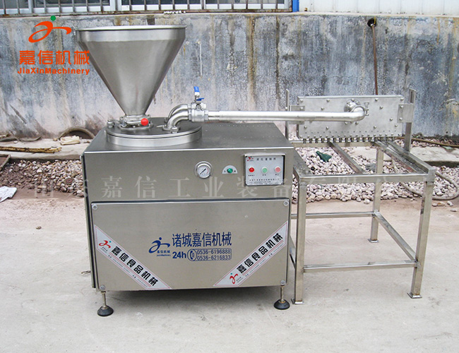 采用活塞式液壓驅動(dòng),調準工作壓力后在液壓缸的作用下,使筒內的物料產(chǎn)生壓力后將料擠出,適用物料范圍較廣,尤其對較干的料餡相對其他灌腸機效果更佳。設備整體結構合理、造形美觀(guān)、性能穩定、操作簡(jiǎn)單、維修方便。