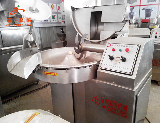 斬拌機利用斬刀高速旋轉的斬切作用,將肉塊,碎肉,脂肪等主要原料精細的斬切成肉餡或肉泥,同時(shí)將其它原料如水,冰片,輔料一起攪拌成均勻的乳狀物。斬刀高速旋轉,可以縮短運行時(shí)間,減少物料發(fā)熱量,保持餡料的天然色澤、彈性、出品率和產(chǎn)品的保質(zhì)期。